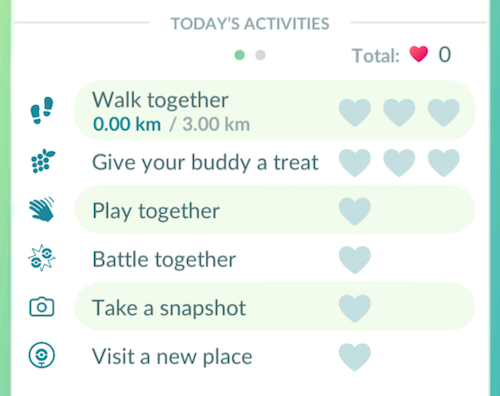 Engaging in Activities allows a temporary increase of Buddy Pokémon's mood and rewards Affection Hearts. The Today's Activities in the Buddy profile screen lists each way to interact with your Buddy. Each time a listed activity was achieved, the hearts will turn from gray to pink, indicating a heart was earned in that category.