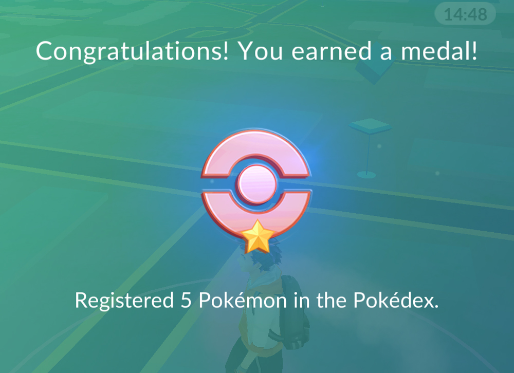 Earning a legacy bronze medal for registering five unique Pokémon to the Pokédex