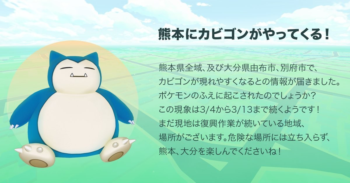 We've received information that in the Kumamoto prefecture and in Oita prefecture, Yufu city and Beppu city, Snorlax has begun appearing more frequently. Was it roused by the Pokémon flute? The phenomenon is expected to continue from March 4 to March 13. There are areas and places where local reconstruction work is continuing. Do not enter a dangerous place. Otherwise, please enjoy Kumamoto and Oita!